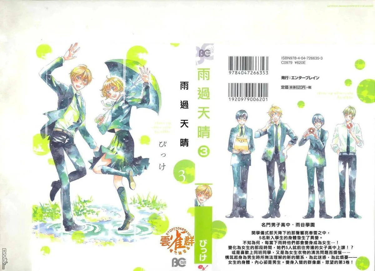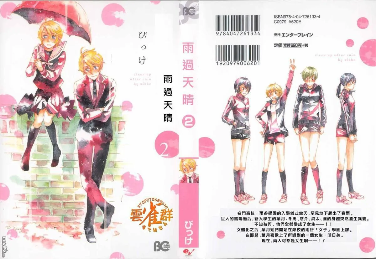 雨过天晴又名,类型为体育竞技的高人气漫画,漫画简介:名门高校·雨谷学园的入学仪式当天,罕见地下起来了春雨。巨大的雷鸣过后,新入学生的叶月、冬马、悠介、圆的身体忽然发生异变。不知为何,他们全都变成了女生——!!女体化之后,叶月她们开始在邻校的雨谷“女子”...