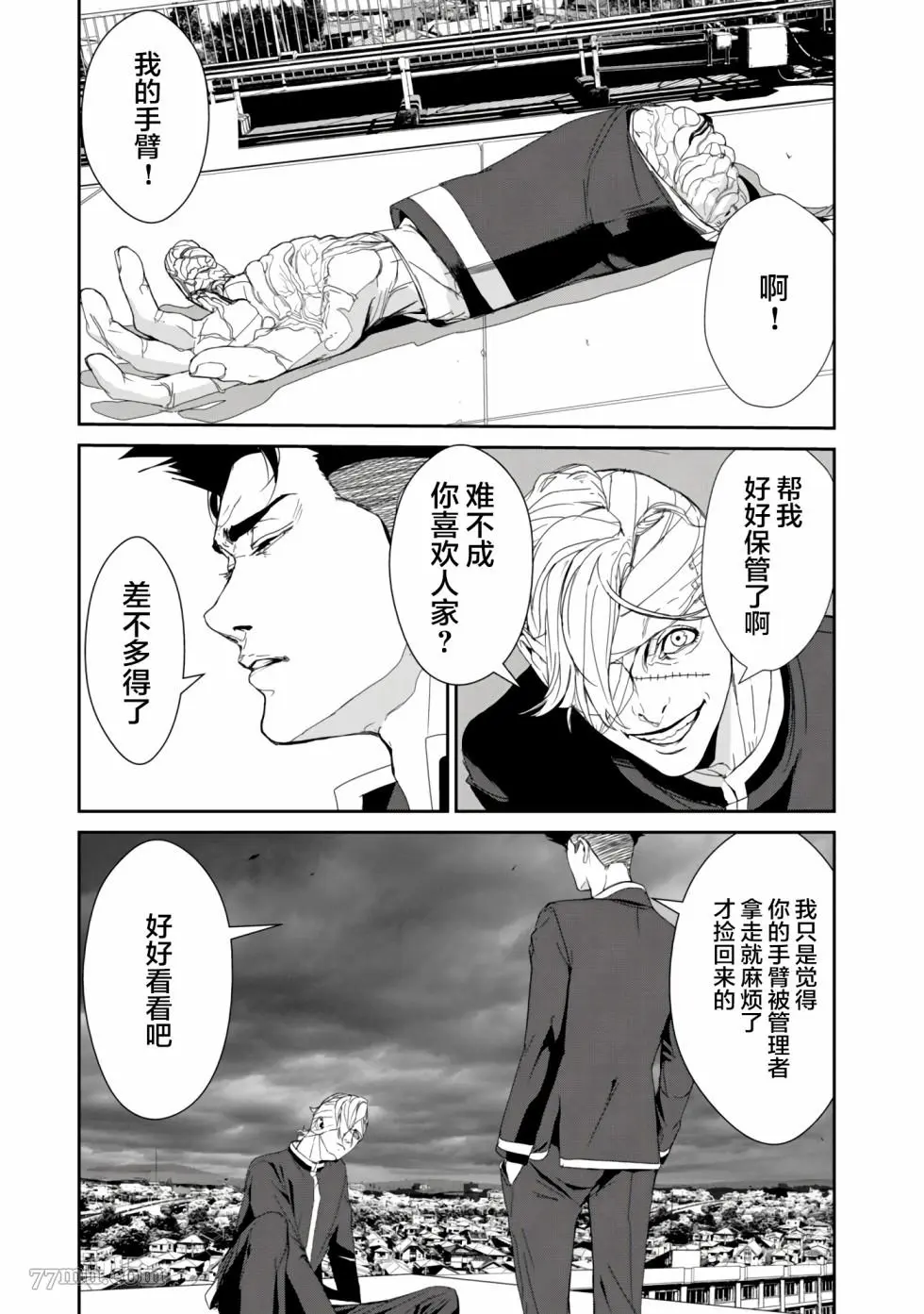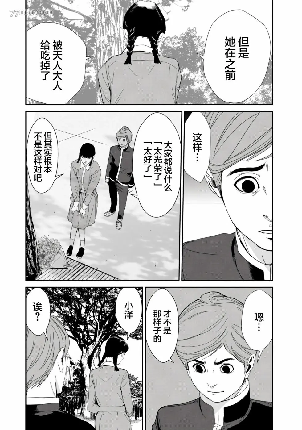食粮人类RE又名 ,类型为恐怖惊悚|推理悬疑的高人气漫画,漫画简介:家畜食用植物,人类食用家畜,而更上一层的“天人”,统治人类、整合人类、食用人类。人类放下战争,逐渐转变成天人所喜爱的乖巧“家畜”。 这天,天泽所暗恋的女孩——莲沼柚,被测出“特等”口感,即将成为天人的食粮。同学们怀着祝福的心,切下小指,准备让柚食用下去,化为美好的回忆…… 在这和平却又极端疯狂的世界,天泽大辉——是个异类。